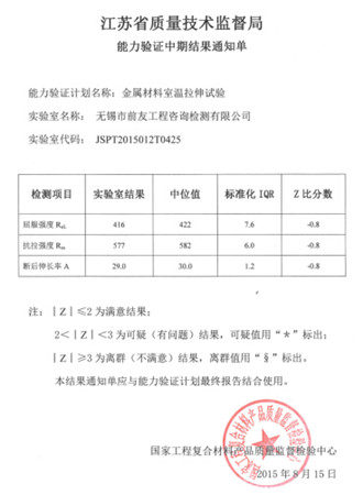 為提高檢測機構金屬材料室溫拉伸檢測水平,省質量技術監督局在全省范圍內組織開展了金屬材料室溫拉伸試驗能力驗證工作。 本次能力驗證項目為金屬材料室溫拉伸試驗,試件為鋼筋。參加單位為全省范圍內凡資質認定(計量認證CMA)具有金屬材料室溫拉伸試驗檢測能力的檢測機構。省質監局委托國家工程復合材料產品質量監督檢測中心為技術支持單位,負責能力驗證作業指導書制定、樣品準備、驗證結果匯總、統計分析等工作。 從省質監局5月13日發文,6月30日發放樣品,到7月10日參加能力驗證單位完成檢測活動,并提交檢測結果報告。8月15日技術支持單位發布了本次能力驗證計劃中期結果通知,無錫市前友工程咨詢檢測有限公司能力驗證中期結果滿意。