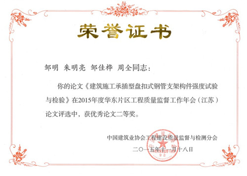 由中國建筑業協會主辦,江蘇省建設工程質量監督總站承辦的2015年度華東片區工程質量監督工作年會,于11月19日~20日在蘇州成功舉行。會前,組織了工程質量監督管理論文征集評審活動,會上頒發了優秀論文獎。由無錫前友咨詢檢測公司撰寫的“建筑施工承插型盤扣式鋼管支架構件強度試驗與檢驗”獲優秀論文二等獎,并入選《工程質量》雜志。 建筑施工承插型盤扣式鋼管支架近十年的開發應用,已成為一種新型模架體系,應用于建筑工程和市政工程中。產學研團隊先后對盤扣支架整架性能、節點構件和構配件進行了大量系統實驗和檢測,旨在科研的基礎上,分列了出廠檢驗、型式檢驗和見證取樣檢測相關要求,為產品出廠檢驗和工程現場驗收確定檢驗項目和判定依據,為建筑施工安全提供技術保證,并為制訂工程行業標準和產品行業標準提供了技術依據。 經過由無錫速捷腳手架公司、東南大學、無錫市前友咨詢檢測公司等單位組成的產學研團隊歷經近十年的不斷深入的研發創新和全國大量建筑、路橋、軌道交通等重點工程成功應用,承插型盤扣式鋼管支架產品品質和應用技術已趨成熟,其支架具有的施工安全可靠度高、承載力大、施工工期短、現場文明美觀等優點已被行業所認同,并成為高大結構支模的首選。承插型盤扣式鋼管支架構件已列入住建部建筑業10項新技術。中華人民共和國行業標準《建筑施工承插型盤扣式鋼管支架安全技術規程》(JGJ231-2010)已由國家住建部于2010年11月17日發布,2011年10月1日起實施。可見,該技術在推廣應用時已有相應標準要求可參照。并且,相關產品的行業標準《承插型盤扣式鋼管支架構件》也已完成送審稿。 為助推新型腳手架技術的推廣應用,確保安全施工,無錫市前友咨詢檢測公司積極創造條件,取得了鋼管扣件、承插型盤扣式鋼管支架第三方見證取樣檢測的資質,并已在無錫市建設工程安全監督站備案。