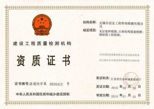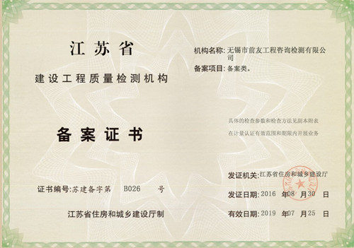 近日,無錫市前友工程咨詢檢測(cè)有限公司從江蘇省住房和城鄉(xiāng)建設(shè)廳行政服務(wù)中心領(lǐng)回了嶄新的《建設(shè)工程質(zhì)量檢測(cè)機(jī)構(gòu)資質(zhì)證書》和《江蘇省建設(shè)工程質(zhì)量檢測(cè)機(jī)構(gòu)備案證書》。據(jù)此,公司資質(zhì)延續(xù)工作已率先順利完成。 自2006年成立以來,公司在各級(jí)主管部門的領(lǐng)導(dǎo)和關(guān)心下,在廣大客戶的支持和配合下,在全體職工的不懈努力下,檢測(cè)能力逐步提高,至今,已具備了以下檢測(cè)資質(zhì)能力項(xiàng)目: 見證取樣類:水泥物理力學(xué)性能;鋼筋(焊接連接)力學(xué)性能;砂、石常規(guī);混凝土、砂漿強(qiáng)度;簡易土工;混凝土摻加劑(外加劑、粉煤灰);瀝青、瀝青混合料;預(yù)應(yīng)力鋼絞線、錨夾具、金屬螺紋管。 專項(xiàng)檢測(cè)類:主體結(jié)構(gòu)工程現(xiàn)場(chǎng)檢測(cè)(包括鋼筋保護(hù)層、現(xiàn)場(chǎng)強(qiáng)度檢測(cè)、結(jié)構(gòu)性能、后置埋件力學(xué)檢測(cè));鋼結(jié)構(gòu)工程檢測(cè)(包括鋼結(jié)構(gòu)工程用鋼材、連接件、鋼結(jié)構(gòu)焊縫質(zhì)量、防腐防火涂層、鋼結(jié)構(gòu)變形);建筑節(jié)能檢測(cè)(建筑節(jié)能材料檢測(cè)、建筑節(jié)能現(xiàn)場(chǎng)檢測(cè)和熱工性能現(xiàn)場(chǎng)檢測(cè))。 備案檢測(cè)類:室內(nèi)環(huán)境檢測(cè)、建筑水電檢測(cè)、墻體、屋面材料、飾面材料、防水材料、門窗檢測(cè)。 安全檢測(cè)類:鋼管、扣件、承插型盤扣式鋼管支架檢測(cè)。 測(cè)繪類:工程測(cè)量、不動(dòng)產(chǎn)測(cè)繪。 其它類:相零線檢測(cè)、 截面尺寸檢測(cè)(現(xiàn)澆樓板厚度檢測(cè))、室內(nèi)空間尺寸檢測(cè)、輕鋼龍骨、石膏板、鋁塑復(fù)合板檢測(cè)。