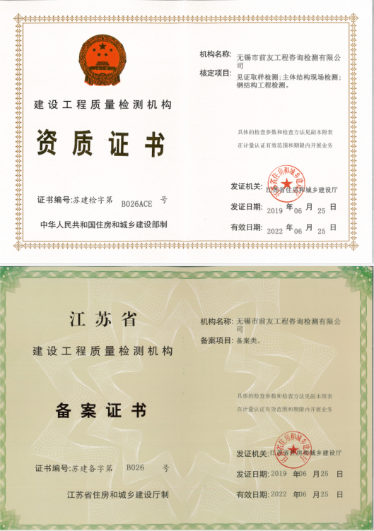 近日,無錫市前友工程咨詢檢測有限公司從江蘇省政務服務中心住房城鄉建設分中心領回了嶄新的《建設工程質量檢測機構資質證書》。據此,公司資質延續工作已率先順利完成。 十多年來,公司經過多輪增項擴項,檢測能力不斷提高,已覆蓋建設工程見證取樣類、專項檢測類、備案檢測類、測繪類、安全檢測類和其他類。同時,已入圍江蘇省裝配式建筑檢測機構名錄和無錫市房屋安全鑒定檢測機構名錄。 檢測資質的順利延續,為公司品質發展奠定了堅實的基礎。公司將虔誠為政府、客戶和社會提供更優質、更全面的咨詢檢測服務。