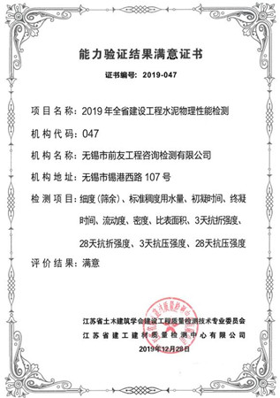 根據《省住房城鄉建設廳關于做好2019年全省建設工程質量檢測能力驗證工作的通知》(蘇建函質[2019]354號)要求,江蘇省土木建筑學會建設工程質量檢測技術專業委員會于2019年10月組織了全省建設工程水泥物理性能檢測能力驗證工作。全省各檢測機構參加,項目參數有:細度、密度、比表面積、流動度、標準稠度用水量、初凝時間、終凝時間、強度(3d、28d)。 近日,省檢測專委會寄來證書,無錫市前友工程咨詢檢測有限公司能力驗證結果滿意。