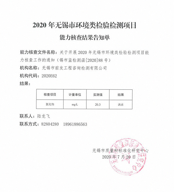 日前,無錫市前友工程咨詢檢測有限公司順利通過了2020年無錫市環境類檢驗檢測項目能力核查,參與的核查項目結果為滿意。 本次能力驗證由無錫市市場監督管理局組織,無錫市質量和標準化研究中心提供技術支持,參加對象為無錫地區內具備核查項目檢驗檢測能力且通過江蘇省市場監督管理局資質認定的檢驗檢測機構。 作為我市骨干建工類檢測機構,公司積極報名,參加了其中“水質中氯化物”參數的核查。核查過程中,檢測人員嚴格按照作業指導書與相關檢驗檢測標準的要求,嚴謹細致地對盲樣進行了試驗,并如實做好原始記錄與視頻記錄,及時提交了試驗結果。