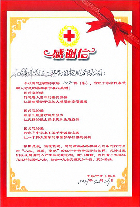 為進一步踐行社會主義核心價值觀,大力弘揚“人道、博愛、奉獻”的紅十字精神,倡導“互助、環(huán)保、節(jié)能、公益”的社會理念,根據(jù)市委市級機關(guān)工委、市文明辦、市紅十字會《紅十字愛心衣物捐贈倡議書》精神,我公司積極組織,大家踴躍捐出款式新、質(zhì)量好的衣物并主動利用節(jié)假日期間對所捐衣物進行清洗、晾曬、消毒,確保捐贈的愛心衣物符合要求,并于2021年1月29日下午將所捐衣物送至無錫市紅十字會。