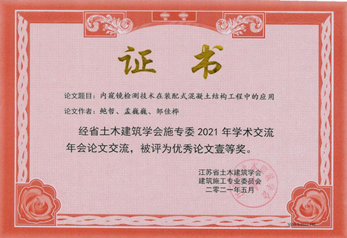 江蘇省土木建筑學(xué)會建筑施工專業(yè)委員會第十屆三次會議暨2021年學(xué)術(shù)交流會于2021年5月26日至28日在揚(yáng)州市召開。 會議總結(jié)交流了各市學(xué)會工作,研究并完善2021年省建筑施工專業(yè)委員會工作計劃;會議組織了學(xué)術(shù)交流,主題為“科技引領(lǐng)建造、創(chuàng)新江蘇施工技術(shù)”;評審了2020年度江蘇省優(yōu)秀施工學(xué)術(shù)論文,從全省各市推薦參加交流的300篇論文中,評出一等獎33篇,二等獎62篇,三等獎85篇;評選了2020年度省土木建筑學(xué)會建筑施工技術(shù)(學(xué)術(shù))先進(jìn)個人12人、先進(jìn)集體6個。 無錫市前友工程咨詢檢測有限公司,為國家高新技術(shù)企業(yè),持續(xù)學(xué)習(xí)創(chuàng)新。這次,由鮑哲等撰寫的“內(nèi)窺鏡檢測技術(shù)在裝配式混凝土結(jié)構(gòu)工程的應(yīng)用”榮獲一等獎。