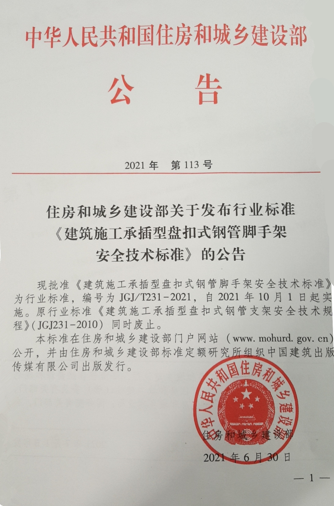 | 公司參編的《建筑施工承插型盤扣式鋼管腳手架安全技術(shù)標(biāo)準(zhǔn)》已獲批 | ||