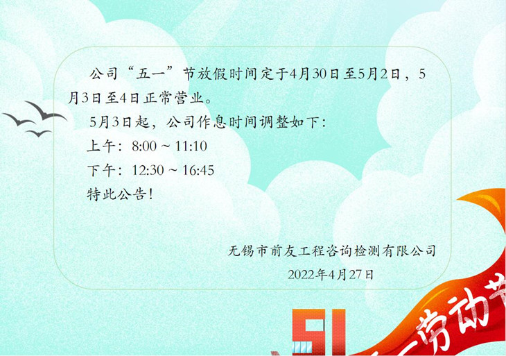 | 關(guān)于“五一”勞動(dòng)節(jié)放假及節(jié)后營業(yè)時(shí)間調(diào)整的公告 | ||