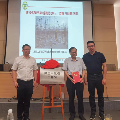 6月19日,無錫市建設工程“安全生產月”主題活動《盤扣式腳手架新規范執行與監管及創新應用》專題講座在無錫錫山三建舉辦。這次活動由無錫市住建局舉辦,無錫市土木建筑學會、無錫市建筑業協會承辦,無錫錫山三建、江蘇速捷模架科技有限公司協辦。 會上,市住建局副局長朱燁昕作主旨講話,錫山三建董事長錢新華致辭并介紹東南大學郭正興教授與江蘇速捷,“郭正興教授工作室”揭牌。 郭正興教授作了“盤扣式腳手架新規范執行與監管及創新應用”主題講座,內容包括:1)盤扣式鋼管腳手架新規范;2)盤扣式鋼管腳手架現場監管;3)盤扣式鋼管腳手架創新應用。講座中,首次提出了標準斜桿設置簡稱“塔中塔”設置(大塔套小塔)理論和構造要求。 市、區建設主管部門領導、有關行業協會領導、市施工學術委員會委員、速接架研發團隊人員和規范編制組部分人員等近百人聽取了講座,無錫前友咨詢檢測公司派員參加。