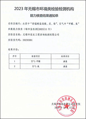 為加強對我市資質認定檢驗檢測機構的事中事后監管,提升檢驗檢測機構技術能力水平,參照《檢驗檢測機構監督管理辦法》相關規定,無錫市市場監督管理局于9月份在全市資質認定檢驗檢測機構中開展市環境類檢驗檢測項目能力核查工作。 本次能力核查工作委托無錫市檢驗檢測認證研究院為技術支持單位,負責能力核查作業指導書制定、樣品準備、結果匯總、統計分析等工作。能力核查項目為空氣中 “甲醛、氨”等檢測參數。 無錫市前友工程咨詢檢測有限公司在規定時間內完成了各項檢測工作,并遞交了相關結果報告。近日,公司收到“2023年無錫市環境類檢驗檢測機構能力核查結果通知單”公司參加的空氣中“甲醛、氨”參數能力核查結果均為滿意。
