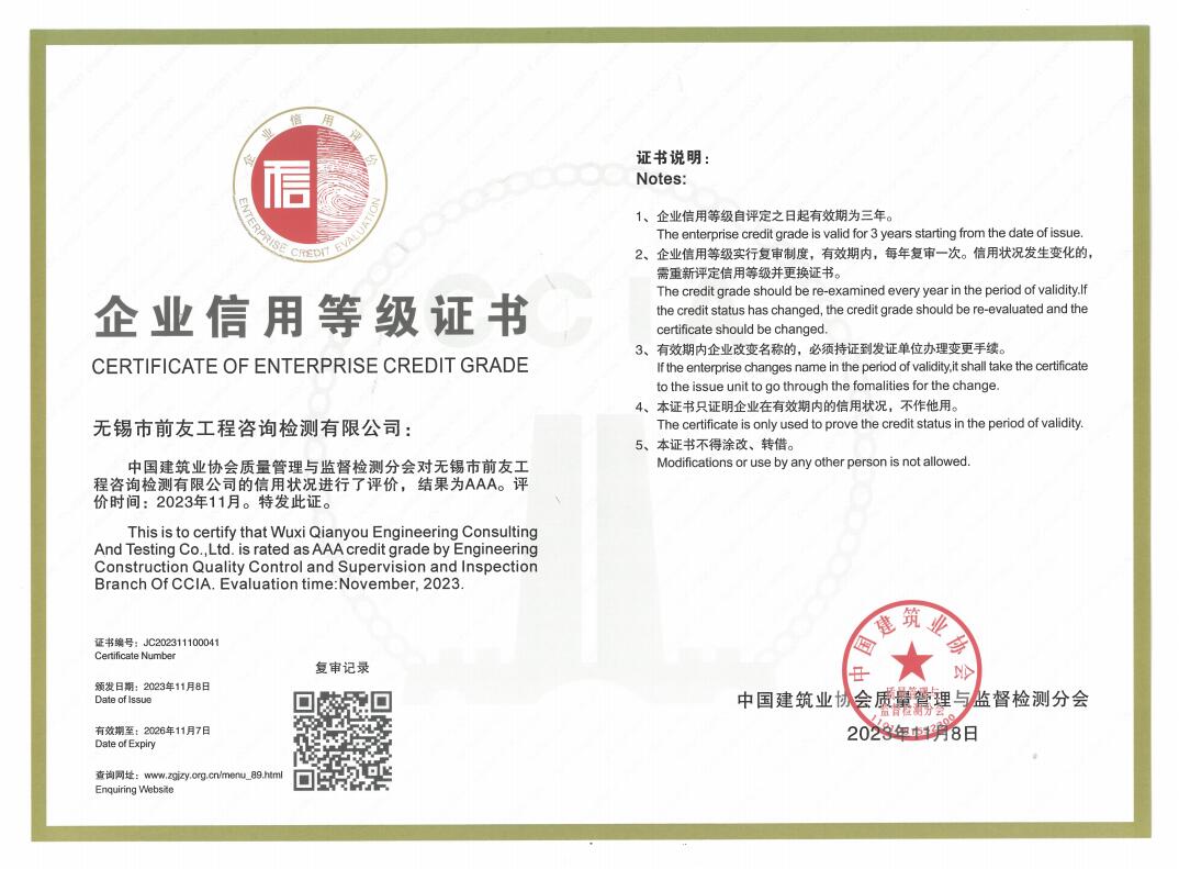 近日,公司收到了中國(guó)建筑業(yè)協(xié)會(huì)頒發(fā)的“關(guān)于公布建筑業(yè)AAA級(jí)信用企業(yè)(檢測(cè)機(jī)構(gòu))的通知”,公司再次榮獲全國(guó)建筑業(yè)AAA級(jí)信用企業(yè)證書(shū)。 為深入落實(shí)國(guó)家信用體系建設(shè)要求,推進(jìn)建設(shè)工程檢測(cè)市場(chǎng)信用體系建設(shè),促進(jìn)企業(yè)誠(chéng)信經(jīng)營(yíng),中國(guó)建筑業(yè)協(xié)會(huì)質(zhì)量管理與監(jiān)督檢測(cè)分會(huì)組織開(kāi)展了2023年度建筑業(yè)AAA級(jí)信用企業(yè)(檢測(cè)機(jī)構(gòu))評(píng)價(jià)工作。本著公開(kāi)、公平、公正的原則,經(jīng)檢測(cè)機(jī)構(gòu)自愿申請(qǐng)、省級(jí)推薦單位推薦、信用信息核實(shí)、專(zhuān)家組綜合評(píng)價(jià)及網(wǎng)上公示,確定北京市建設(shè)工程質(zhì)量第一檢測(cè)所有限責(zé)任公司等142家檢測(cè)機(jī)構(gòu)為2023年度建筑業(yè)AAA 級(jí)信用企業(yè)(檢測(cè)機(jī)構(gòu)),現(xiàn)已發(fā)文公布。 誠(chéng)信企業(yè)的建設(shè)永遠(yuǎn)在路上。無(wú)錫市前友工程咨詢檢測(cè)有限公司將以此作為加快公司高質(zhì)量發(fā)展的新動(dòng)力,進(jìn)一步加強(qiáng)信用體系建設(shè),練實(shí)內(nèi)功,優(yōu)化服務(wù),積極履行社會(huì)責(zé)任,為促進(jìn)行業(yè)持續(xù)健康發(fā)展做出新的貢獻(xiàn)。