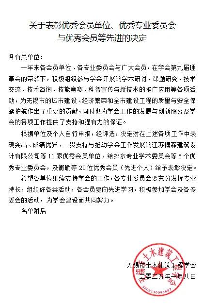最后張鵬飛副主席對土木學會2024年獲得無錫市科協年度綜合評選“五星”級學會、獲得首批一流學會表示祝賀。張主席強調,學會需進一步強化創新引領,深化與高校產學研合作;不斷提升服務能力和水平,優化技術咨詢與服務對接;同時,加強學會自身建設與管理,優化會員結構,共促行業蓬勃發展。